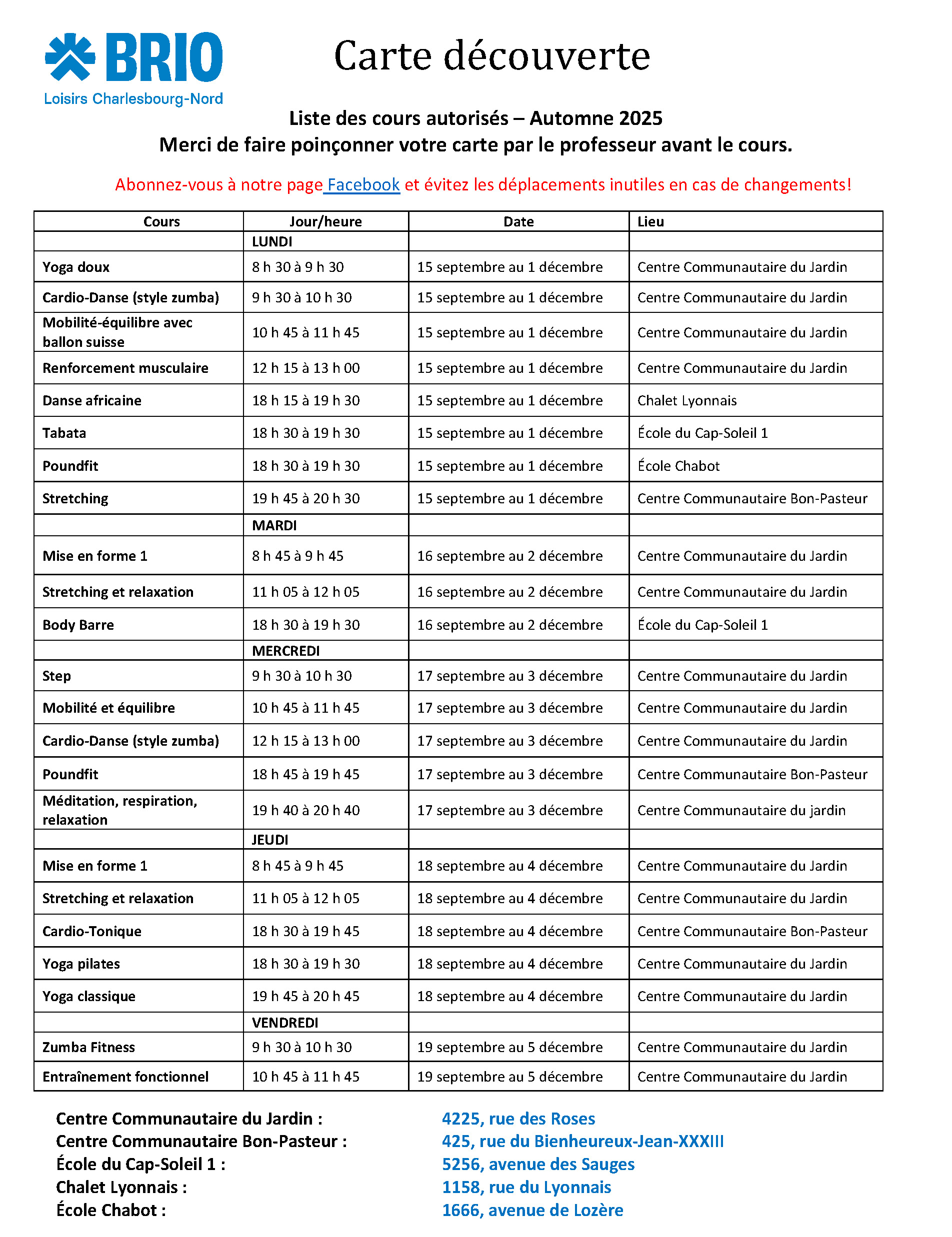 Pour les personnes qui ont acheté une carte découverte, Cliquez ICI pour voir la liste des cours autorisés pour la session en cours.